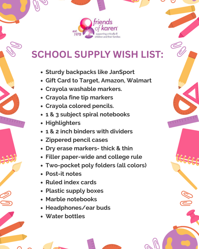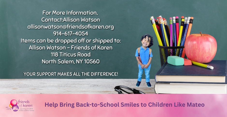 You can help Friends of Karen’s critically ill children, and their siblings start the new school year with backpacks filled with all the essential supplies they need. You relieve parents financially when they are consumed with caring for an ill child and give them peace of mind knowing their children will be ready to start the new school year.