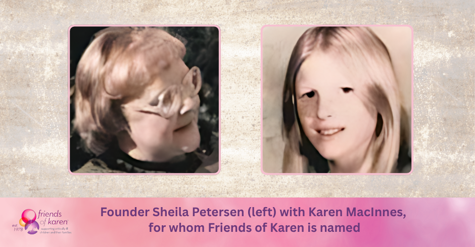 Sheila Petersen, a family friend, appealed to the community about the plight of Karen and her family. Friends and neighbors gave generously to help pay the mounting bills for the ‘round-the-clock care Karen needed during the last 11 months of her life. After Karen died, her family expressed their wish that Sheila continued to help other families with a catastrophically ill child. Sheila named her effort Friends of Karen, and used the remaining funds to help another child, and then another…Today, Friends of Karen helps hundreds of ill children and their families every month.